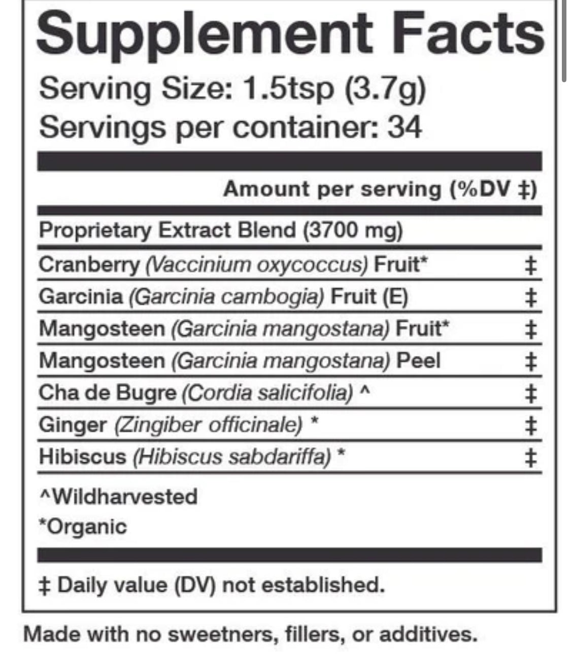 Ingredients:Â Cranberry (Vaccinium oxycoccus) Fruit*, Garcinia (Garcinia cambogia) Fruit (E), Mangosteen (Garcinia mangostana) Fruit*, Mangosteen (Garcinia mangostana) Peel, Cha de Bugre (Cordia salicifolia)^, Ginger (Zingiber officinale) Root*, Hibiscus (Hibiscus sabdariffa) Flower*