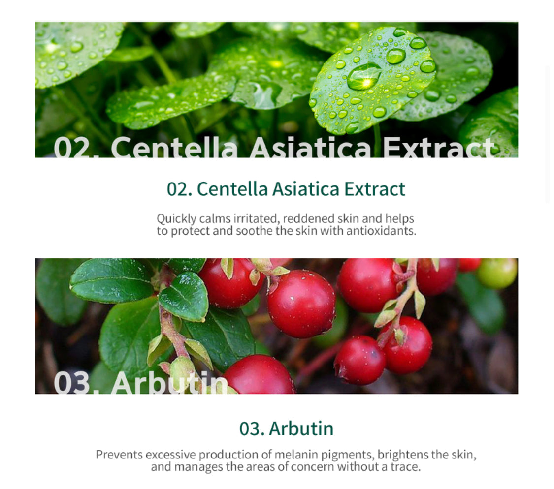 Ingredients Water, Dipropylene Glycol, Dimethicone, Glycerin, Triethylhexanoin, Butylene Glycol Dicaprylate/Dicaprate, Cetearyl Alcohol, 1,2-Hexanediol, C14-22 Alcohols, Stearic Acid, Methyl Glucose Sesquistearate, Beeswax, Butyrospermum Parkii (Shea) Butter, Centella Asiatica Extract, Portulaca Oleracea Extract, Hamamelis Virginiana (Witch Hazel) Leaf Extract, Biosaccharide Gum-1, Allantoin, Tocopheryl Acetate, Ceramide NP, Cholesterol, Acrylates/C10-30 Alkyl Acrylate Crosspolymer, Calendula Officinalis Flower Extract, Morus Alba Leaf Extract, Panax Ginseng Root Extract, Phellinus Linteus Extract, Cornus Officinalis Fruit Extract, Carthamus Tinctorius (Safflower) Seed Extract, Polygonatum Officinale Rhizome/Root Extract, Jasminum Officinale (Jasmine) Flower Extract, Pueraria Thunbergiana Root Extract, Phaseolus Radiatus Seed Extract, Orchid Extract, Arbutin, C12-20 Alkyl Glucoside, Hydrogenated Lecithin, Ethylhexyl Methoxycinnamate, Tromethamine, Carbomer, Sodium Hyaluronate, Dipotassium Glycyrrhizate, Butylene Glycol, Disodium EDTA, Oligopeptide-1