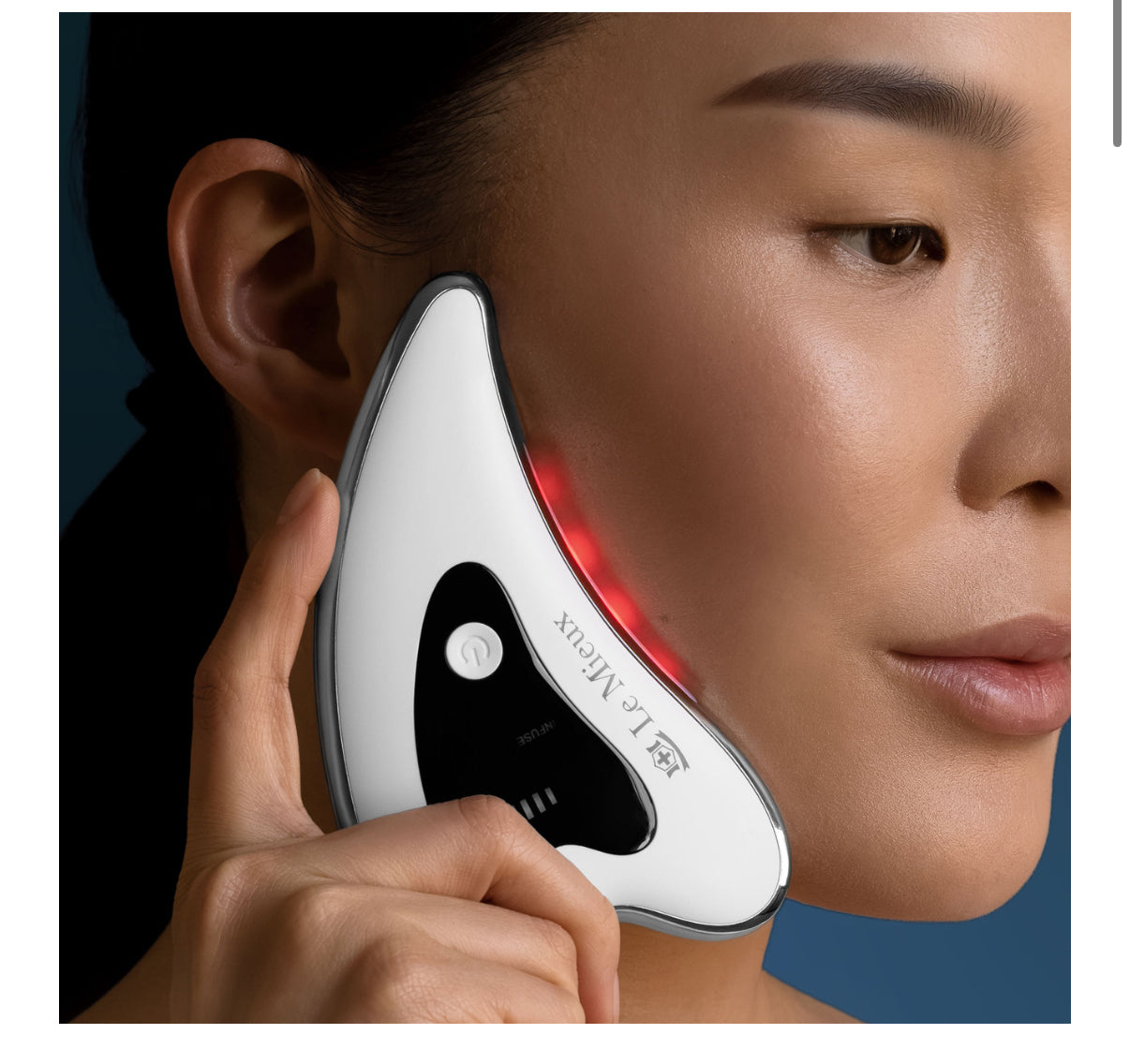 After charging tool, apply Le Mieux skincare product. Press and hold Power On button. Select mode, then glide the tool gently in 1 direction along Meridian lines for 5-10 minutes using Meridian points as reference. Use Contour mode with long gua sha strokes to drain. Use Lift and Infuse mode with upward scooping strokes to sculpt. We love using this with the collagen Beauty Oil