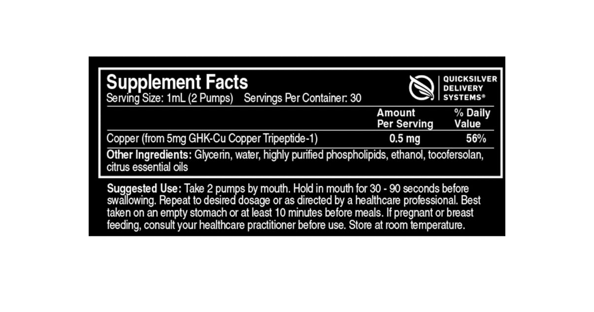 Serving Size: 1mL (2 Pumps) Amount Per Serving: Copper … 0.5 mg (from 5mg GHK-Cu Copper Tripeptide-1) Other Ingredients: Glycerin, water, highly purified phospholipids, ethanol, tocofersolan, citrus essential oils If pregnant or breast feeding, consult your healthcare practitioner before use. Store at room temperature. Other Ingredients: Glycerin, water, highly purified phospholipids, ethanol, tocofersolan, citrus essential oils