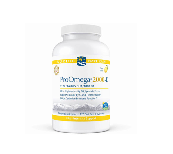 2000 mg EPA+DHA plus 1000 IU of natural vitamin D3 per serving Delicious natural lemon flavor Highest-concentration, triglyceride-form omega oil Achieves American Heart Association recommended doses for heart health* Unmatched support for heart, brain, and eye health * Supports bone health and helps optimize immune function* Triglyceride form for better absorption of essential omega-3s* In addition to the omega-3 benefits of ProOmega 2000, each serving of ProOmega 2000-D provides 1000 IU of natural vitamin D3 (cholecalciferol), meeting the daily recommendation for children and adults who donโt receive adequate sun exposure.