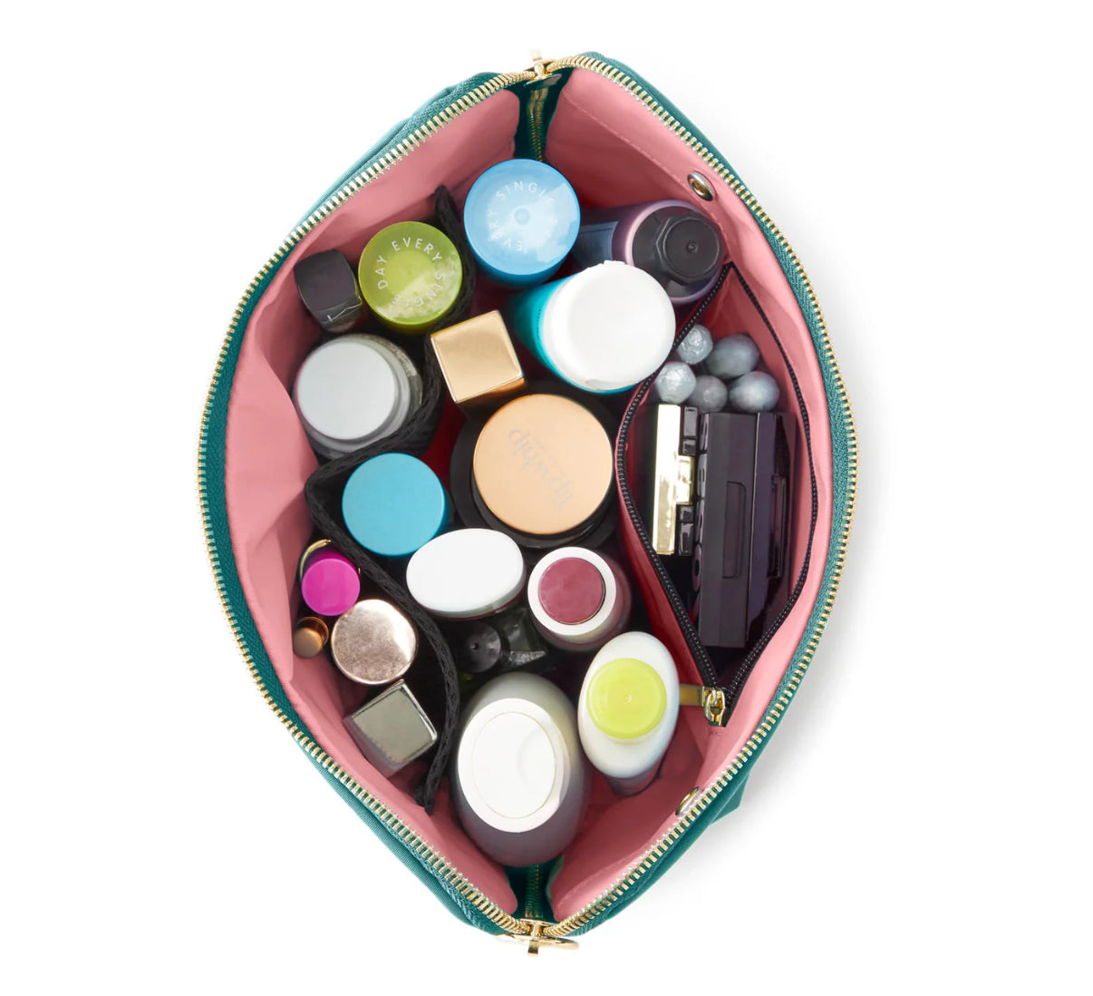 Upgrade to the makeup bag that not only stores and protects your makeup, but has pockets made for your beauty blender, eyelash curler, and more. The Signature Makeup Bag has roomy compartments and opens on three sides to allow for easy access to see all of your products. No more digging! Add a Snap-in an Organizer for more organization and separation. Fabric bags are fully machine washable. Leather bags have a zip-out interior liner that is machine washable.
